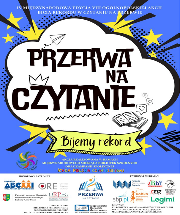 „PRZERWA NA CZYTANIE „ AKTUALNOŚCI PROJEKTY 27 października, 2023 Sylwia Oczyńska W ramach realizacji Narodowego Programu Rozwoju Czytelnictwa w naszej szkole 31 października (wtorek) odbędzie się „PRZERWA NA CZYTANIE” bijemy rekordy. W tym dniu przynosimy książkę, którą będziemy czytać na przerwach.