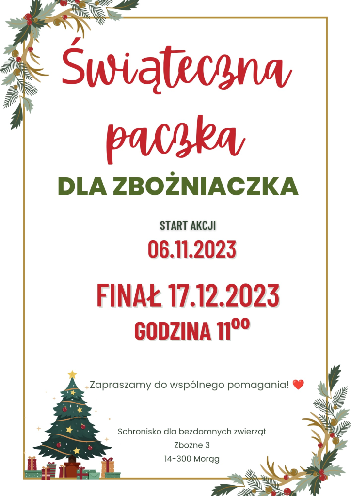 TAK JAK ROK TEMU ZAPRASZAMY WSZYSTKIE KLASY  WRAZ  Z WYCHOWAWCĄ  DO AKCJI ŚWIĄTECZNA PACZKA DLA ZBOŻNIACZKA  2023!