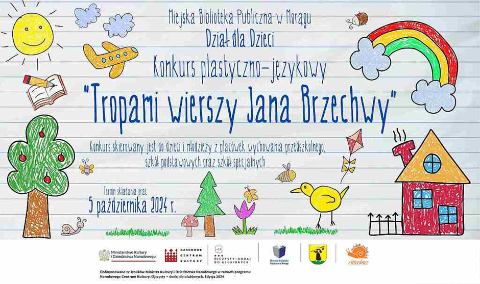 Serdecznie zapraszamy do wzięcia udziału w konkursie plastycznym, pt.: „Tropami wierszy Jana Brzechwy” wszystkie dzieci i młodzież z placówek wychowania przedszkolnego, szkół podstawowych oraz szkół specjalnych z gminy oraz miasta Morąga. To właśnie wiersze tego poety staną się inspiracją do stworzenia pięknych i kolorowych prac plastycznych. Zachęcamy do zapoznania się z twórczością Jana Brzechwy, w naszym księgozbiorze posiadamy duży wybór wierszy i bajek.