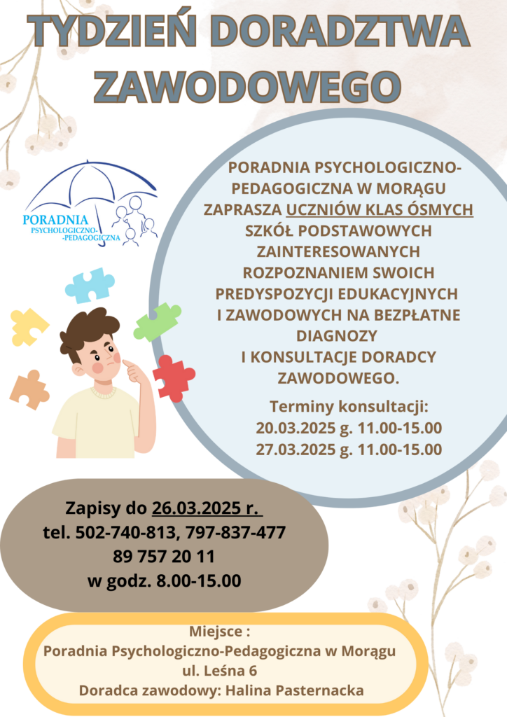 Poradnia Psychologiczno-Pedagogiczna w Morągu zaprasza rodziców i uczniów klas ósmych na bezpłatne diagnozy i konsultacje doradcy zawodowego. Poradnia Psychologiczno-Pedagogiczna w Morągu 897572011